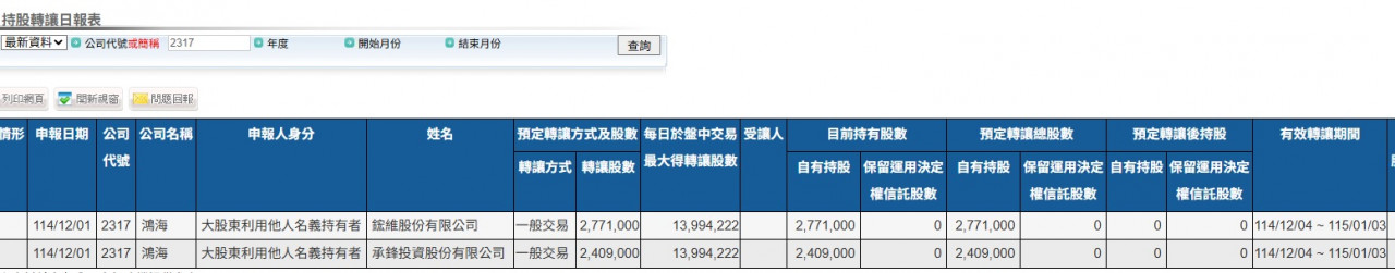 由鴻海(2317)創辦人郭台銘長女郭曉玲擔任代表人的承鋒投資公司與鋐維公司,周一(12/1)申報轉讓手中總共5180張鴻海股票,而且是全部出脫,預定轉讓期間是12月4日起至明年1月3日。