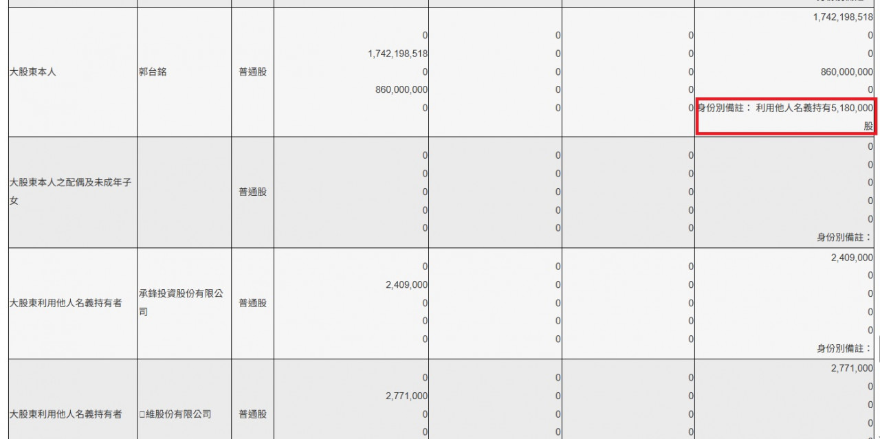 若根據公開資訊觀測站的最新內部人持股異動事後申報表,截至今年10月,大股東郭台銘持有17億4219萬8518股鴻海股票,其中有518萬股是由「大股東利用他人名義」所持有,也就是鋐維公司及承鋒投資公司。