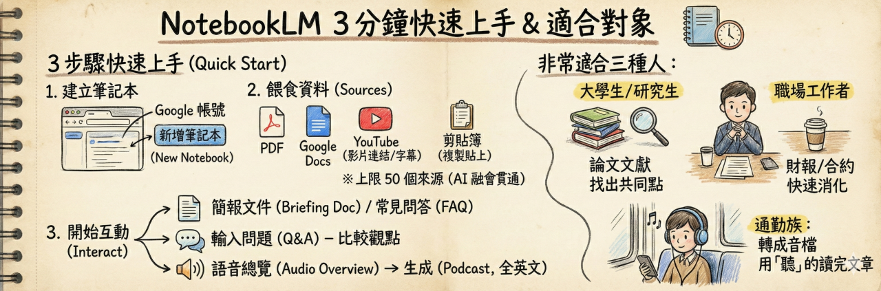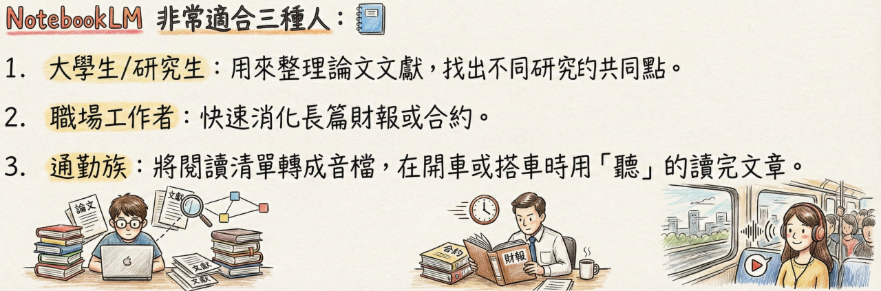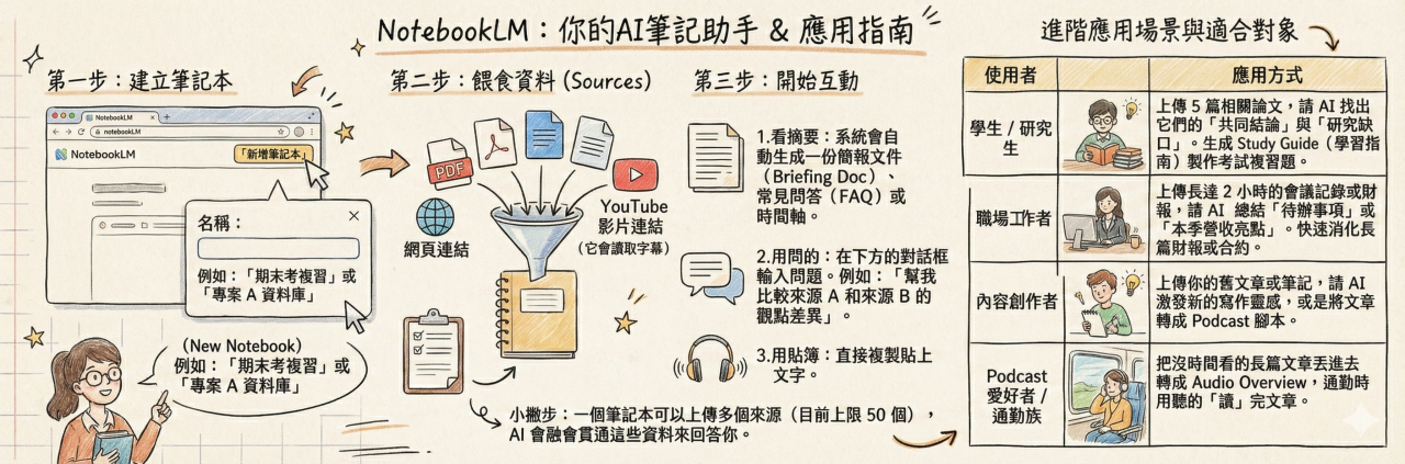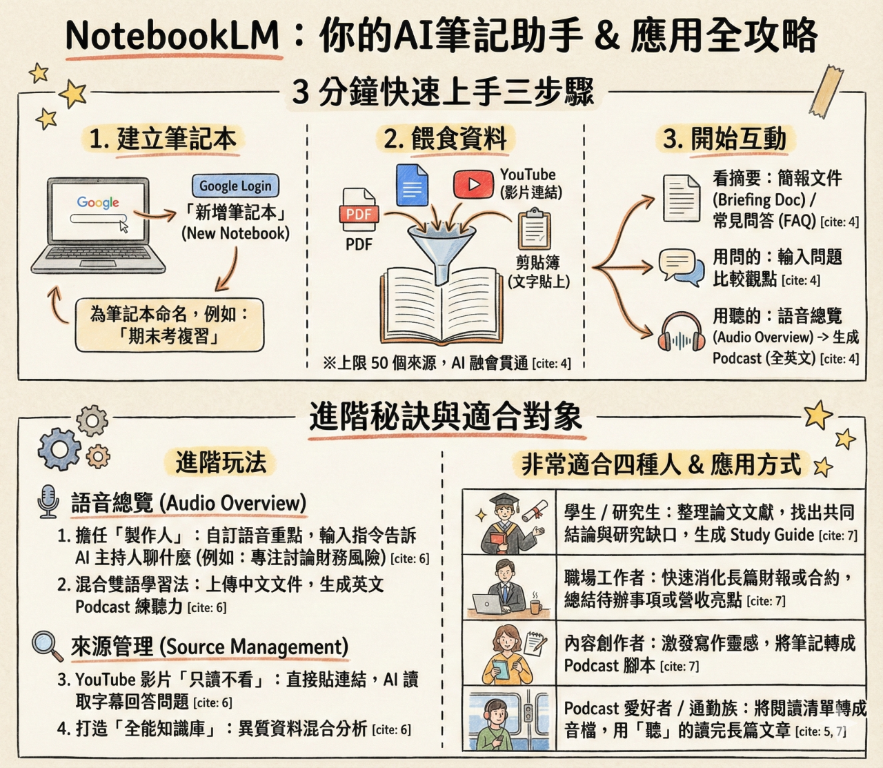 - 秘訣:在一個筆記本內,同時上傳:一篇 PDF 論文、一個相關的 YouTube 訪談連結、以及你自己寫的 Google Doc 筆記。