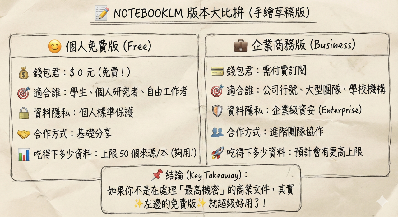 免費版:適合個人學習、研究。雖然 Google 承諾不會用你的個人數據訓練模型,但企業通常需要更嚴格的合約保障。