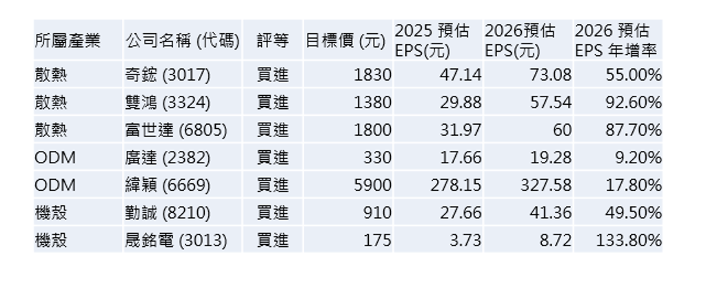 在推薦個股當中,該投顧點名散熱廠奇鋐、雙鴻(3324)、富世達(6805);ODM廠廣達、緯穎(6669)及機殼股勤誠、晟銘電(3013)等7檔。其推薦理由如下: