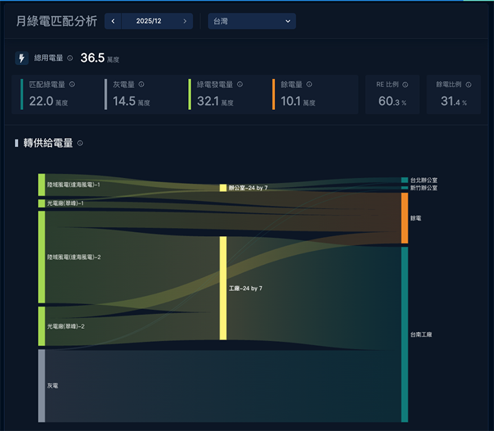 透過視覺化呈現用電、轉供綠電與餘電分布,精準掌握綠電轉供狀況。