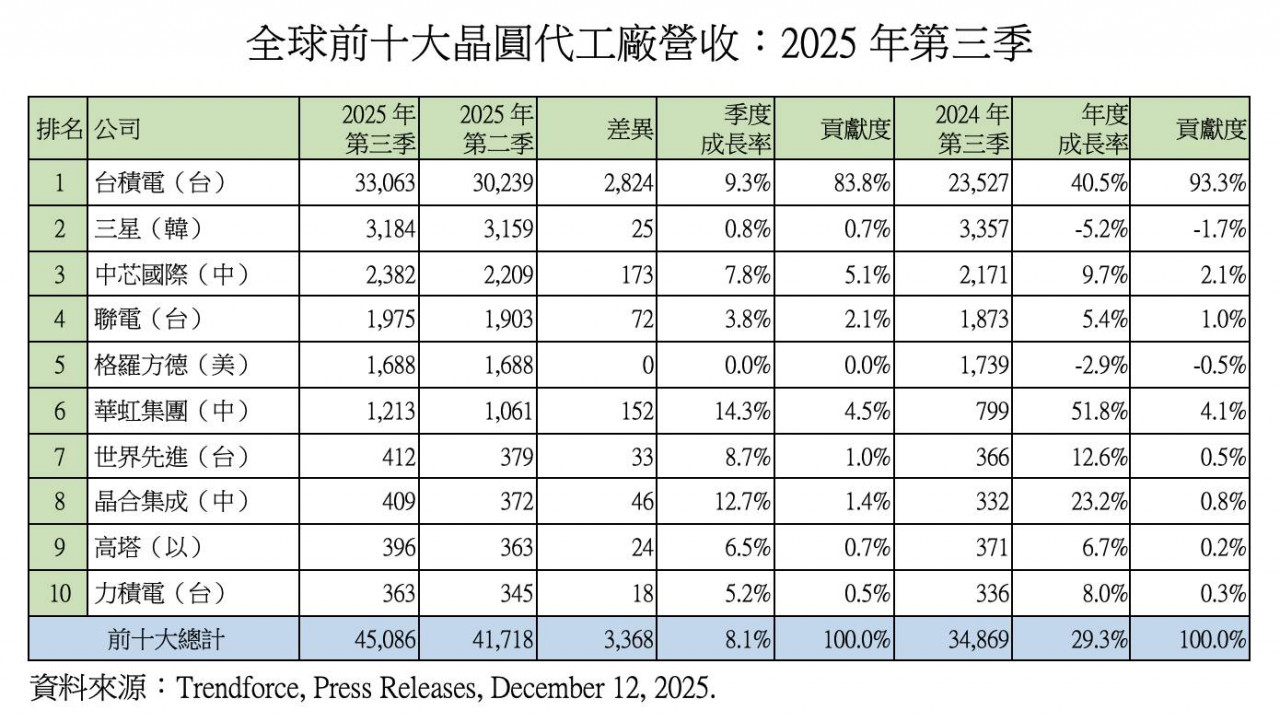 2025 年第三季,全球晶圓代工產業持續呈現穩健成長。根據市調機構 TrendForce 最新研究,全球前十大晶圓代工廠於 2025 年第三季合計營收達 450.9 億美元,較前一季成長 8.1%,相較 2024 年第三季則年增 29.3%。在 AI 高效能運算需求延續,以及新一代消費性電子產品陸續上市的帶動下,整體產業景氣維持溫和復甦態勢。