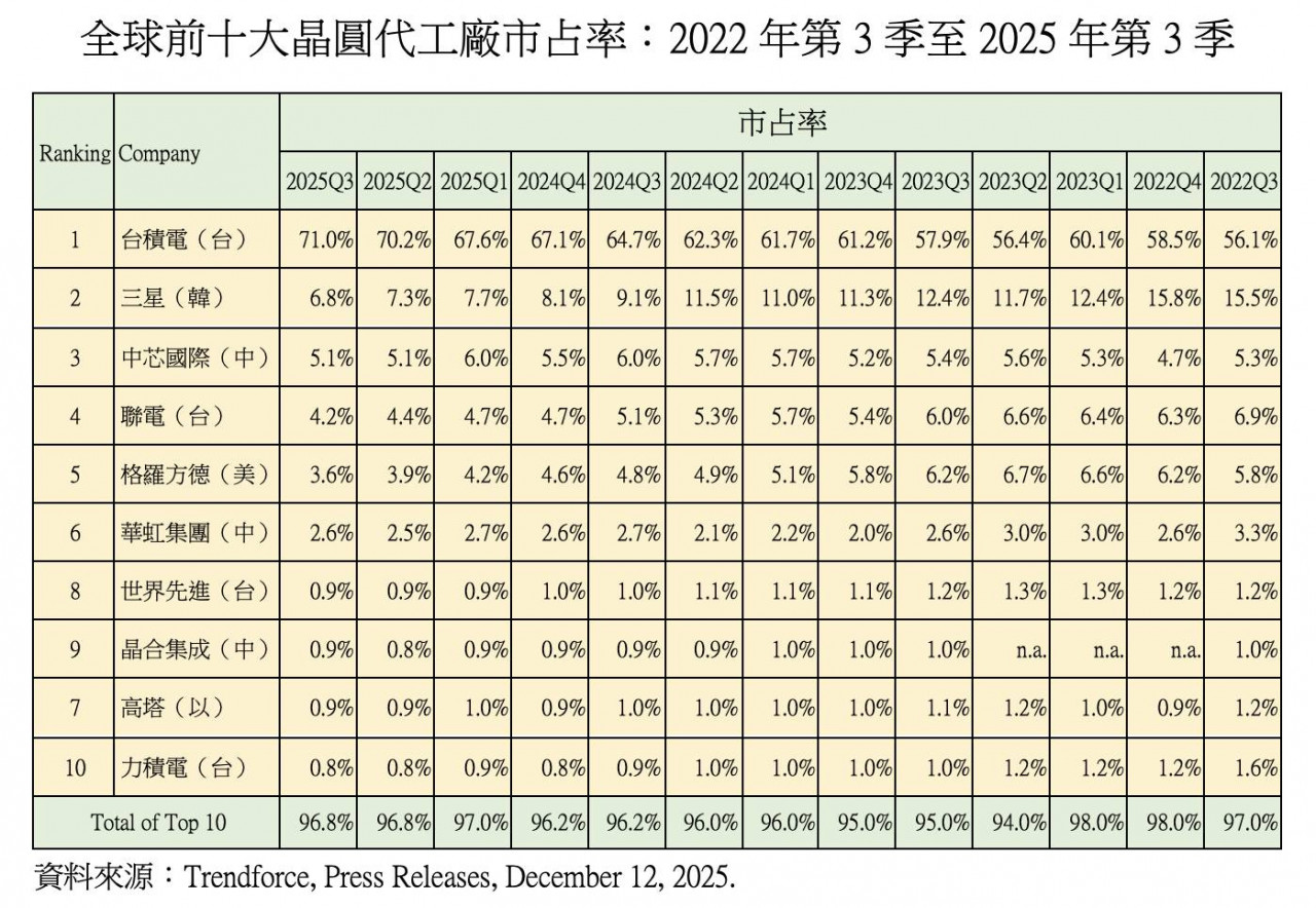 從 2022 年第三季至 2025 年第三季,台積電市占率由 56.1% 提升至 71.0%,三年內增加近 15 個百分點;同期三星市占率則由 15% 以上下滑至6%–7%區間。