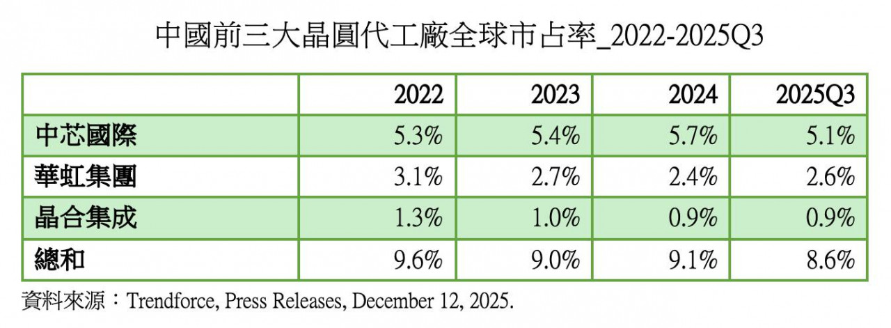 若進一步觀察中國主要晶圓代工廠的全球市占率變化,可更清楚理解其成長的實質內涵。根據 TrendForce 數據,中芯國際、華虹集團與晶合集成三家合計全球市占率,自 2022 年的 9.6% 下降至 2025 年第三季的 8.6%,顯示即便在政策支持與內需拉動下,其整體全球影響力仍呈現盤整,並略有下滑。