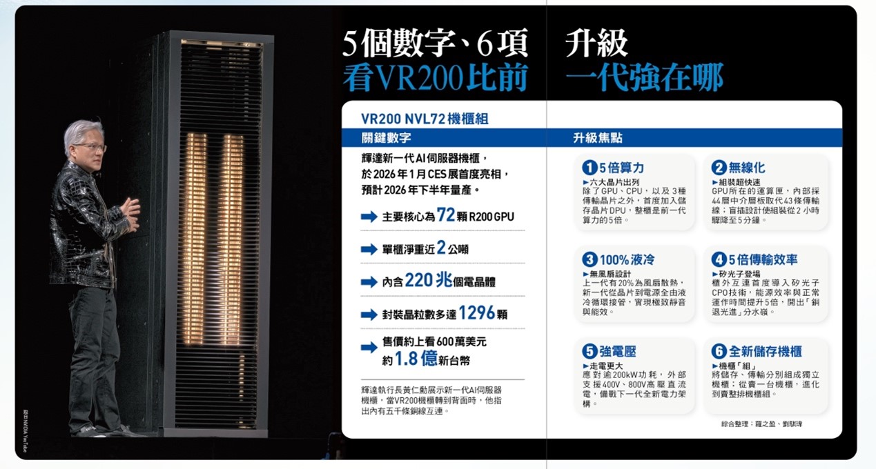 Vera Rubin(以下稱VR)已進入全面量產,」輝達(NVIDIA)執行長黃仁勳在一月拉斯維加斯消費電子展(CES)大手一揮,新一代AI伺服器機櫃VR200 NVL72正式亮相,「我們從晶片做整套機櫃組、再到基礎建設,從模型到應用程式,我們正在從各個層面重新定義AI(人工智慧)。」