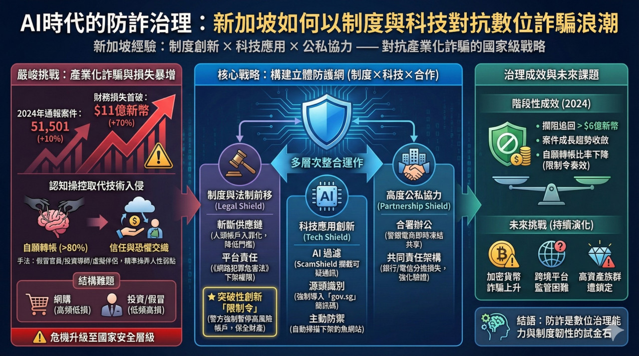 新加坡的經驗顯示,防詐治理不能倚賴單一手段,而須透過法律賦權、科技創新與公私協力的整合運作,形成立體防護網。在人工智能時代,防詐已不僅是治安問題,更是數位治理能力與制度韌性的試金石。