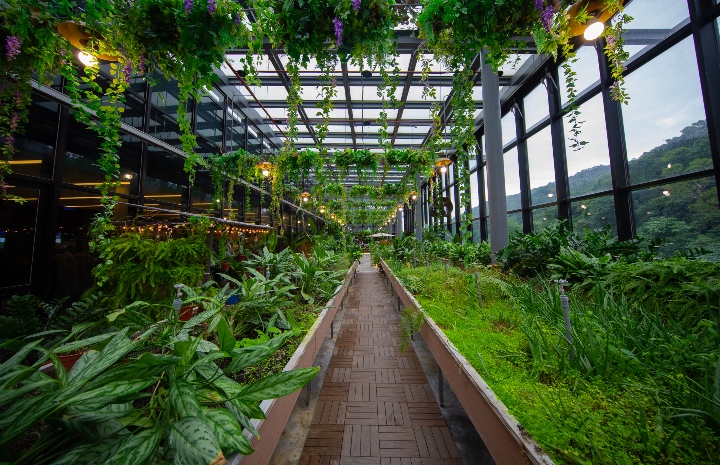 安永心食館內的冬蒔茶屋,其綠意空間由舊有植物工廠改造,室內綠植造景與戶外蔥鬱的九股山合一,並結合在地農產提供風味餐點。