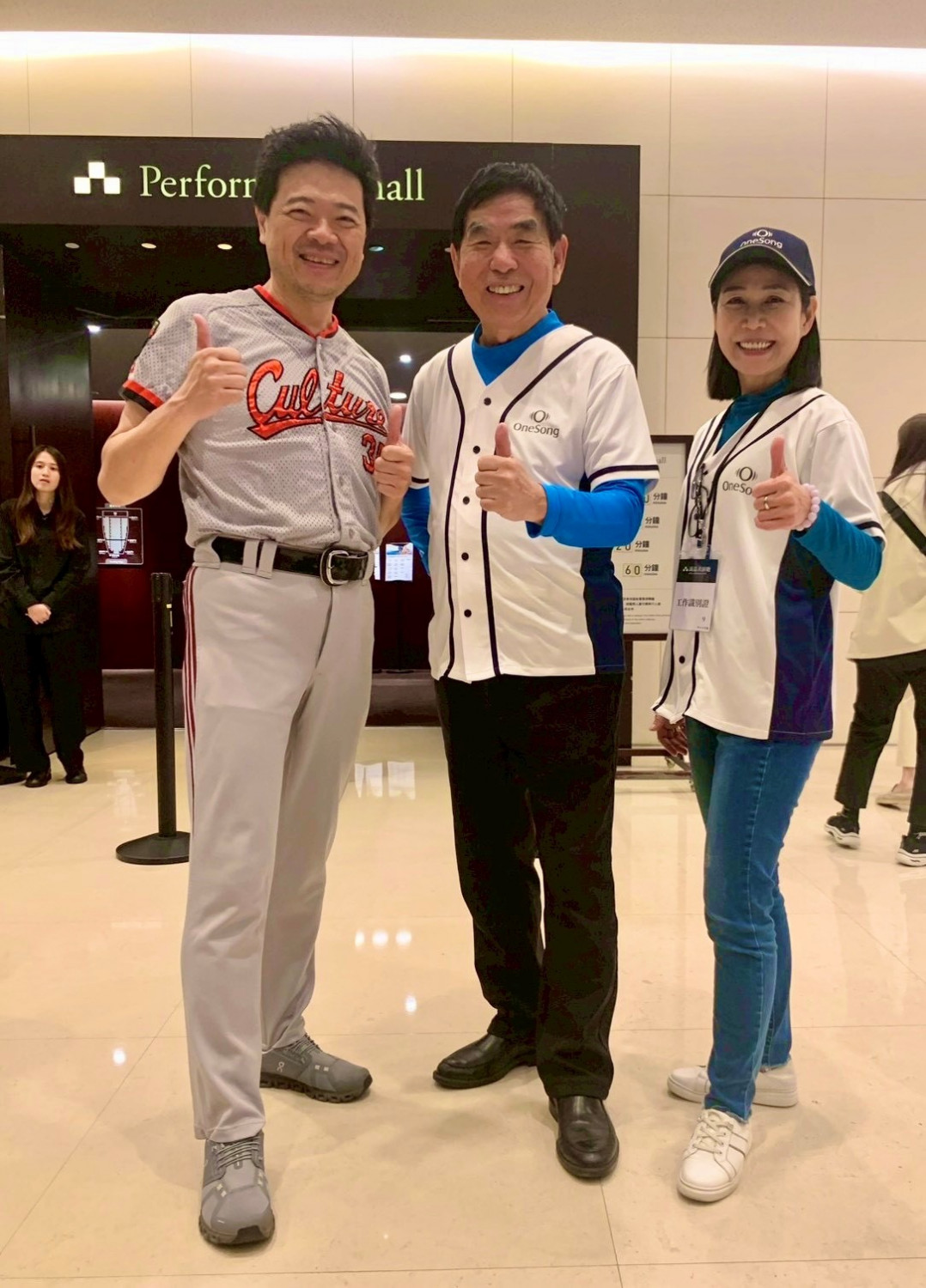圖說二:自左至右為灣聲樂團音樂總監李哲藝、宏碁創辦人之一的黃少華,以及灣聲的執行長陳冬梅,都穿上棒球服。(灣聲提供)