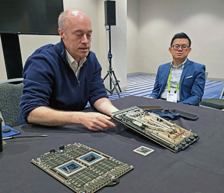 輝達超大規模和高效能運算副總裁巴克(左)在媒體聯訪中,展示最新的Groq3晶片。