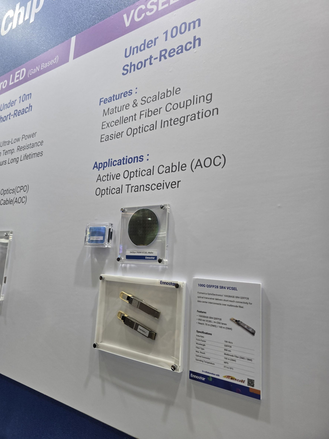 在此次的Touch Taiwan展覽中,富采更首度揭露,正與鴻海轉投資的光收發模組廠傳承光電合作100G AOC(使用富采的25G VCSEL發光元件),準備應用在企業級資料中心市場。此外,富采開發的CW laser產品,也已有ELS(外部光源模組)客戶有興趣合作。