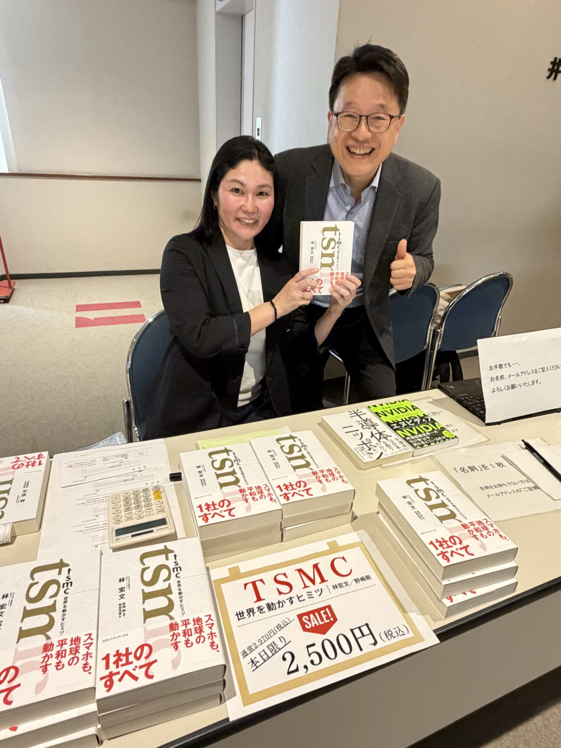 ▲日本出版社準備了作者的書《tsmc,推動世界的祕密》,做映後簽書會。(照片來源:林宏文提供)