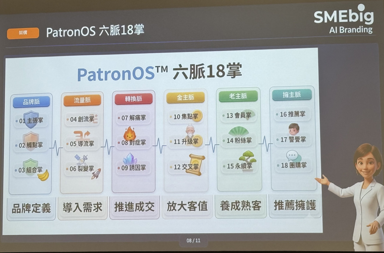 「PatronOS主顧品牌作業系統,是一套可打通中小品牌生意六脈、從定位清晰到營收放大,裝有AI Agent品牌作業系統,可讓團隊照表操課,做好品牌、創造知名度、導流新顧客戶、引導舊顧客主動回購並擁護推薦他人購買,能在AI代理人時代,建立企業品牌的韌性與競爭力。」