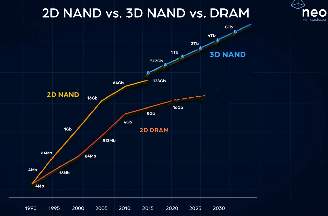 從過去DRAM與NAND的容量擴增速度對比,就可以看出兩大記憶體產業的明顯差別。DRAM自2014年製程技術進展到20奈米,就開始陷入瓶頸,台積電邏輯IC都已進入2奈米甚至往埃米級推進,但DRAM即使到今天都尚未進展到10奈米以下製程,讓DRAM容量擴增明顯受到限制,12年來從8Gb、16Gb再成長到24Gb,成長速度已放緩。(下圖一,NEO公司提供)
