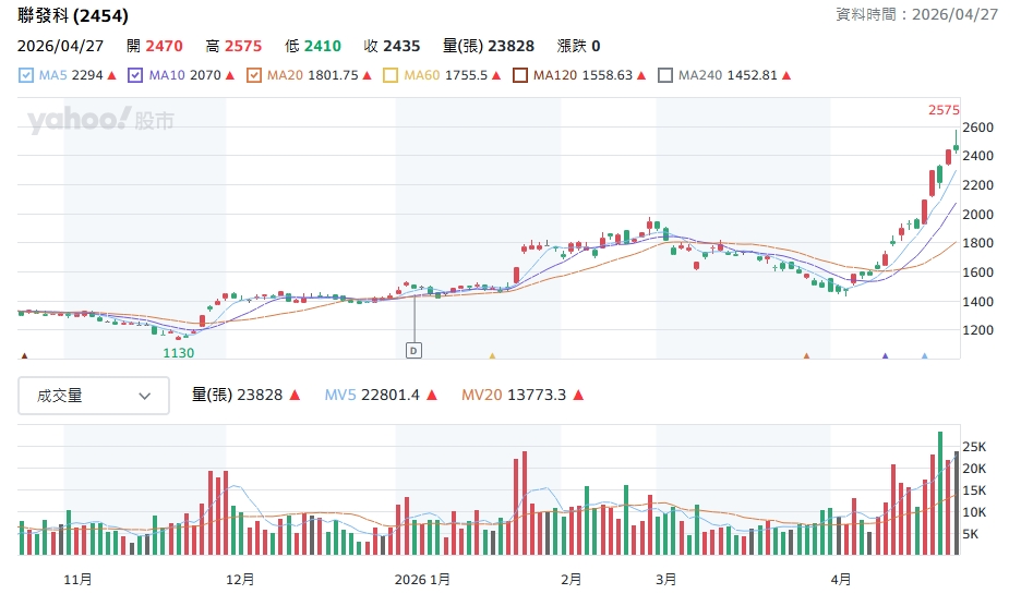 回顧聯發科股價走勢,4月起即「驚驚漲」,即便在美伊戰火的干擾下,聯發科股價依舊從4月初的1480元上下,周一衝盤中高點2575元,股價遠勝護國神山台積電。