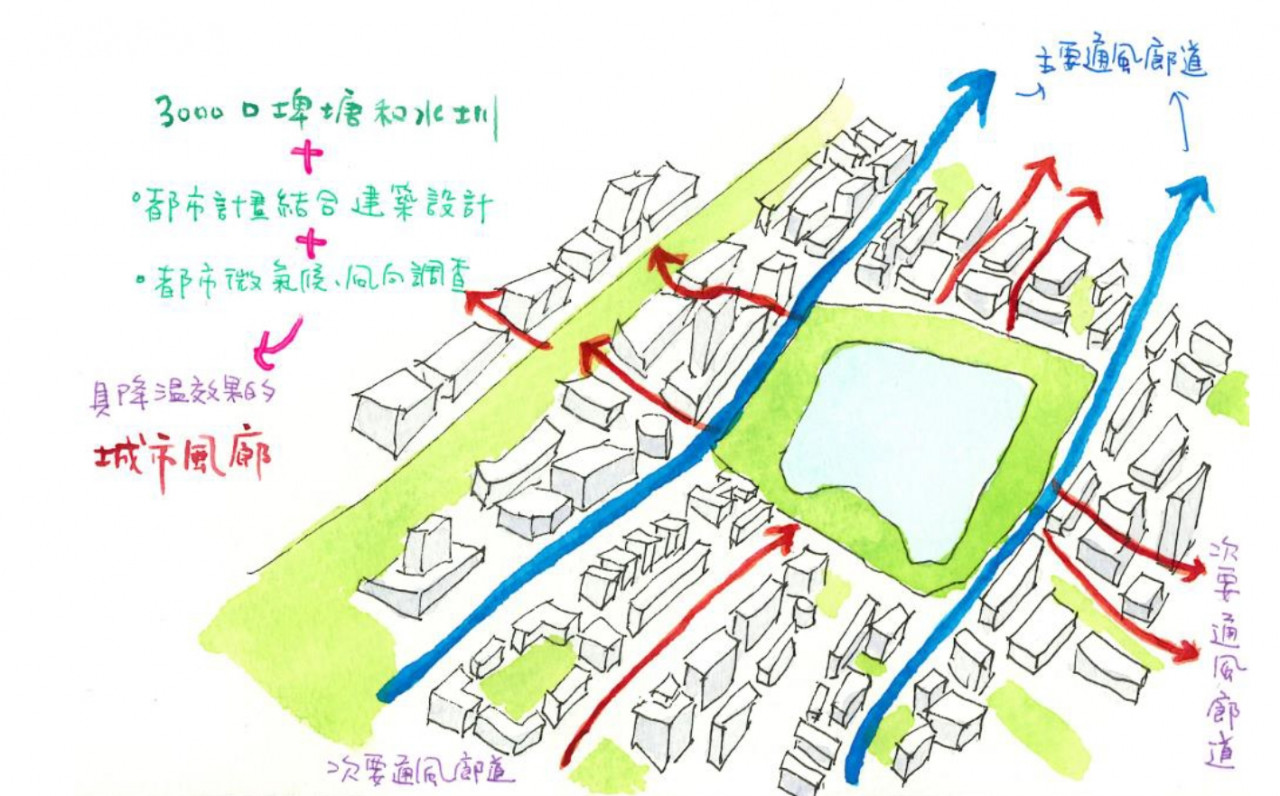 第三,桃園特有的都市設計。他指出,桃園擁有超過三千口埤塘與水圳,這些源自古大漢溪斷頭河道改造的水利系統,如今仍扮演重要角色。市府正思考如何將埤塘與綠地納入都市設計,形成「生態跳島」與「風廊效應」,藉此調節微氣候、降低都市熱島,展現桃園獨特的城市樣貌。