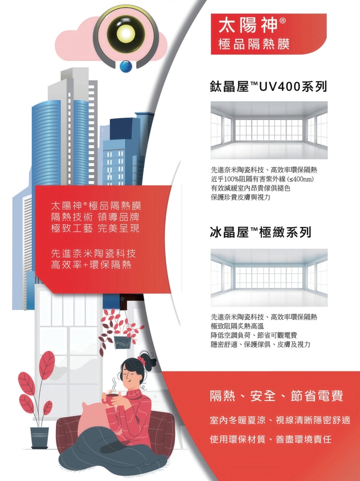 太陽神極品隔熱膜可以應用於汽車車窗與住家商辦窗戶。在住家商辦部分提供「冰晶屋」與「鈦晶屋」兩大旗艦款系列。「冰晶屋」極致系列具備極高效率隔熱功能,特別適合高溫環境使用,能夠顯著降低空調負荷,提升能源使用效能。「鈦晶屋」UV400系列則更進一步提高紫外線隔離係數,使更有效阻擋紫外線,減緩室內昂貴家具褪色,及增進人體舒適健康。