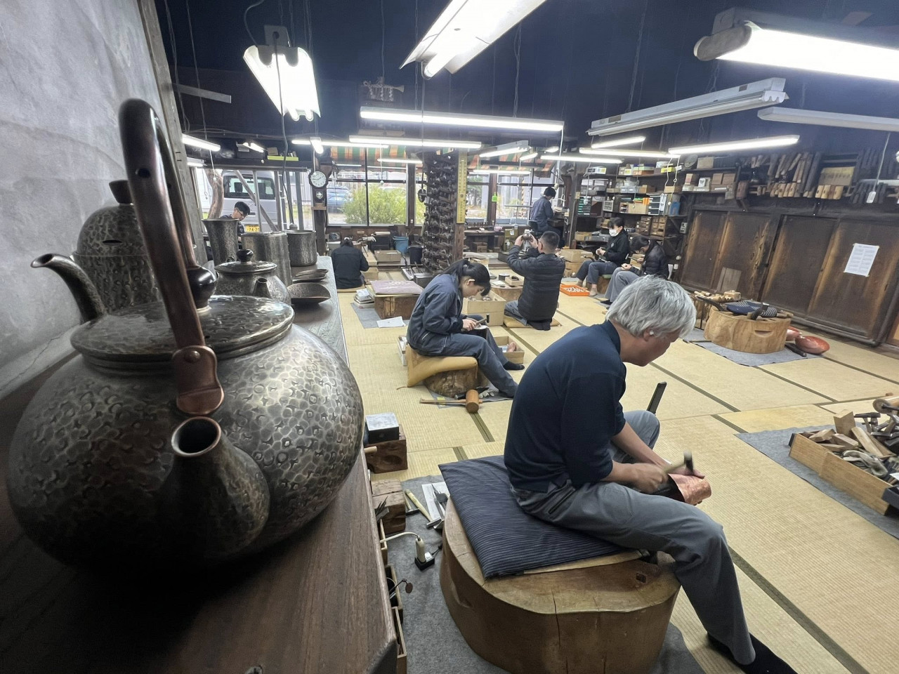 玉川堂的工作室就在那幾塊榻榻米上,幾坪大的空間裡,十幾個人敲打著銅器,這樣的工匠精神已經傳到第七代,經歷了210年。