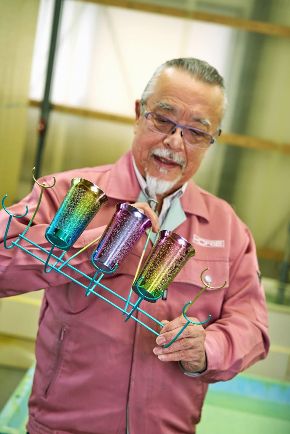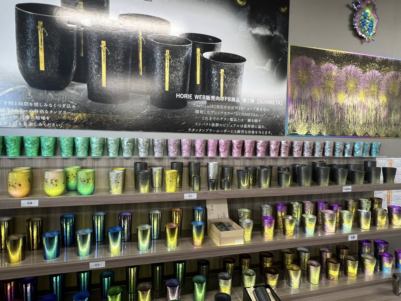 Horie透過鈦金屬陽極氧化控制電壓,生產不同顏色的鈦杯,鈦金屬杯在1055度的窯爐中重生,透過不同顏色,賦予迷人的外觀,保冷性極佳,可長時間防止冰塊融化。堀江拓爾先生來台送我一個鈦金屬杯,夏天喝冰水特別有感覺。