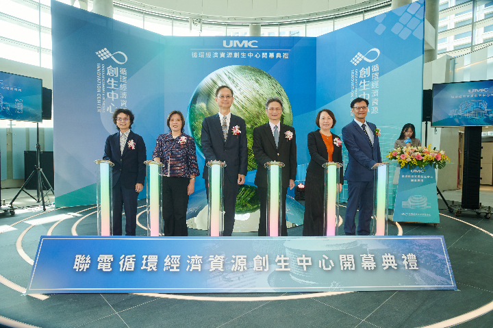 聯電循環經濟資源創生中心開幕典禮。(圖左到右:台南市副市長趙卿惠、環境部資源循環署署長賴瑩瑩、聯電共同總經理簡山傑、國科會副主委蘇振綱、南科管理局局長鄭秀絨、聯電資深副總經理吳宗賢)。
