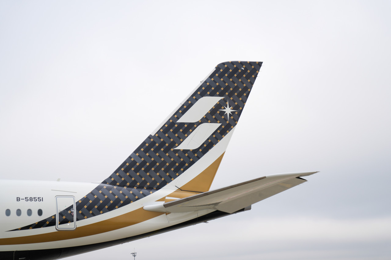 星宇航空A350-1000採用全新特殊塗裝,融合A350-1000採用碳纖維複合材的概念,將專屬的碳纖維編織繪上尾翼,今日首度在桃園機場亮相。圖/星宇航空