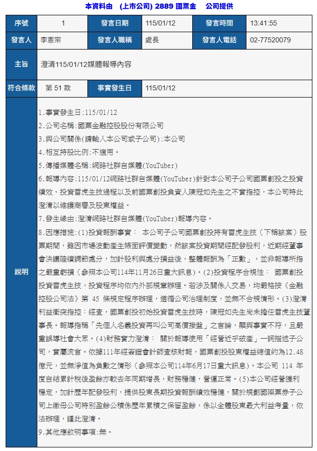 國票金也發布重大訊息,針對網路社群自媒體YouTuber針對國票金子公司國票創投投資績效、投資雷虎生技過程以及前國票創投負責人陳冠如的不實指控,特別澄清說明。