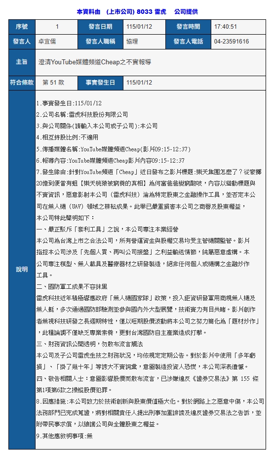 雷虎科技發出重訊公告,嚴正駁斥「套利工具」說法,強調雷虎科技為台灣上市合法公司,所有營運資金與股權交易均受主管機關監管。YouTube媒體頻道Cheap影片指控雷虎涉及「先個人買、再叫公司接盤」利益輸送情節,純屬惡意虛構。雷虎專注模型、無人載具及醫療器材的研發製造,絕非任何個人或機構的金融炒作工具。