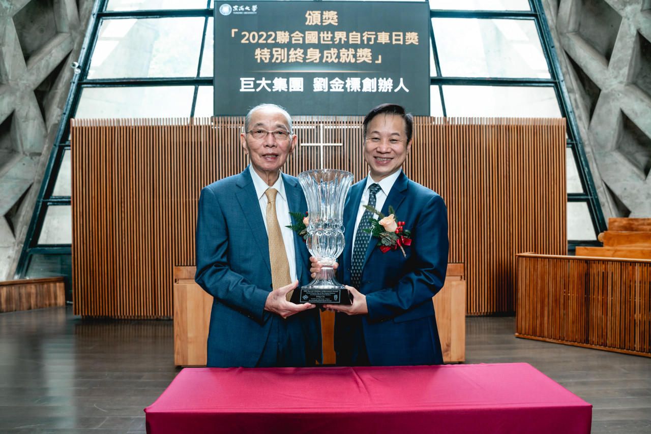 ▲2022年劉金標(左)獲聯合國世界自行車日「特別終身成就獎」,肯定其對全球單車文化的貢獻 。