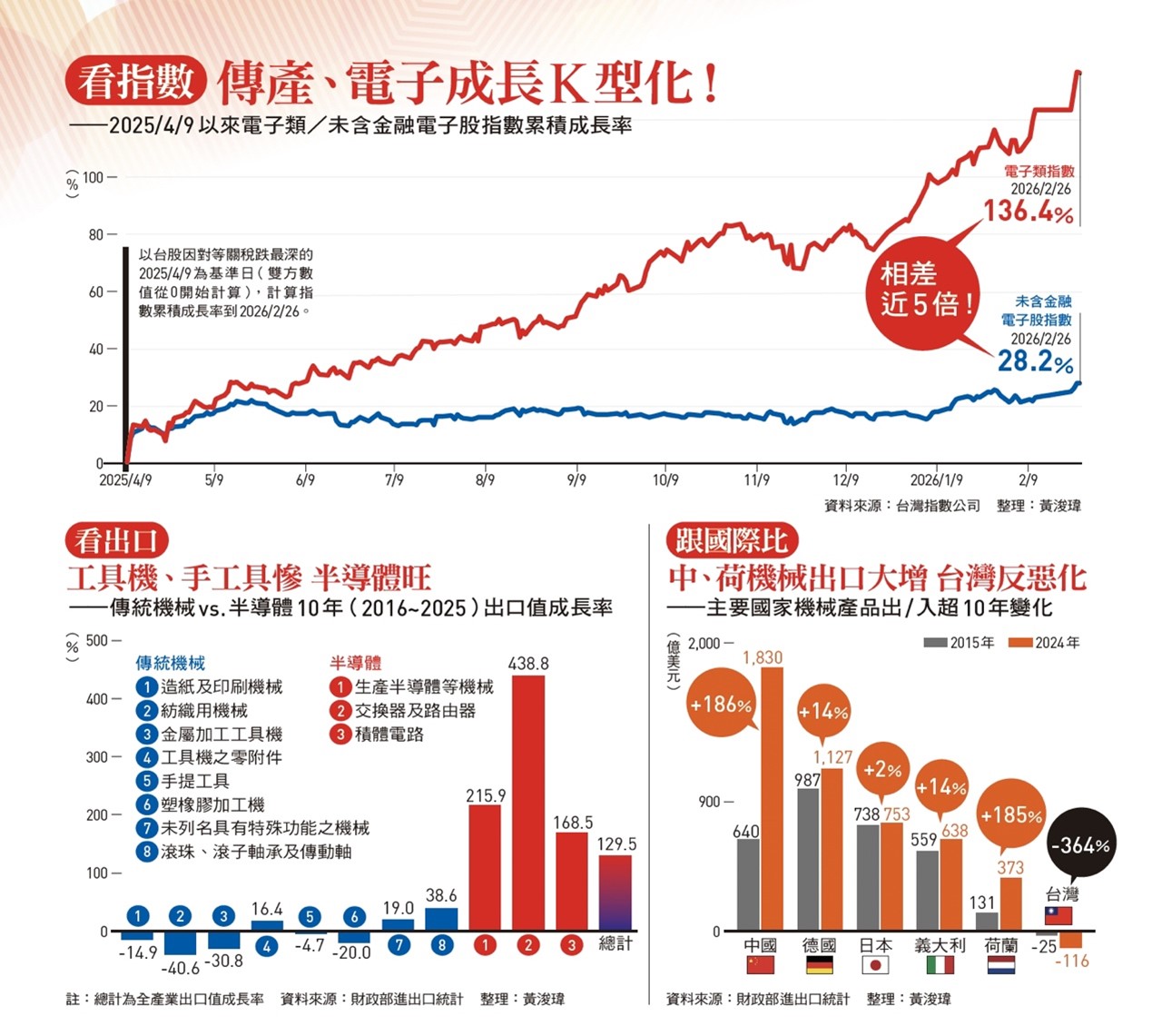 出口增長的兩樣情,更是清晰地顯現在資本市場,自二五年四月九日因對等關稅衝 [一張含有 文字, 螢幕擷取畫面, 字型, 圖表 的圖片 自動產生的描述] 擊台股大幅回檔後,電子類股與非電子、金融產業的走勢也出現分歧姿態;截至今年二月二十六日,電子類股指數累積上漲逾一三六%,非電子、非金融類股的成長率僅二八%,兩者差距近五倍之多。