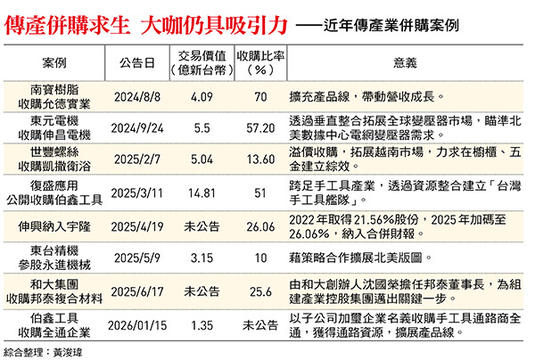 放眼看去,傳產業透過併購求生,已慢慢形成聲量,去年,至少已經看到至少五家機械加工相關上市公司完成併購案:世豐螺絲收購凱撒衛浴、伸興納入宇隆、東台精機參股永進機械、和大集團收購邦泰複合材料。其中,東台取得永進一成股權,更被業界視為是在為工具機產業整併試水溫。