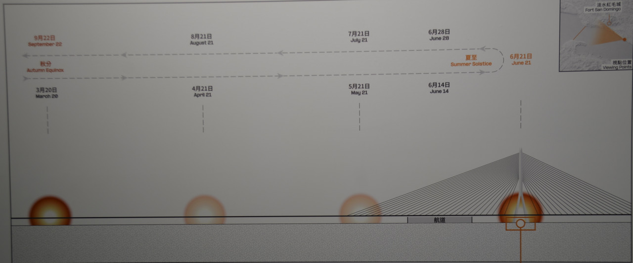 當民眾從紅毛城沿步道走向漁人碼頭時,淡江大橋會自然出現在視線前方,與觀音山、水岸景觀交織成河口新天際線。而夕陽則會隨著四季更迭,緩緩在橋面移動,直至6月夏至時與橋塔融為一體。