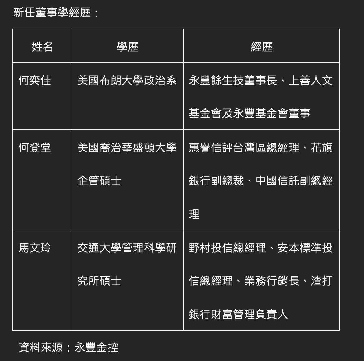 在新任董事部分,何奕佳為美國布朗大學政治系畢業,現任永豐餘生技董事長、上善人文基金會及永豐基金會董事。她創立「Green & Safe」品牌及通路,長期致力於環境保護與ESG實踐,創立《山海樓》連續六年獲得米其林一星及四年米其林綠星的肯定,透過創新推動永續發展。她並以虛實整合的全面行銷能力擴大影響力,希望借重她在推展品牌影響力的經驗,為銀行注入品牌知名度成長動能及強化客戶認同。