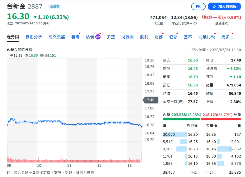 不過,兩家公司合併更名第一天,台新金(2887)股價卻是不給力,開盤重挫超過5%,終場下跌1.1元或6.32%,收在16.3元,爆天量47.1萬張,後續股價表現仍有待觀察