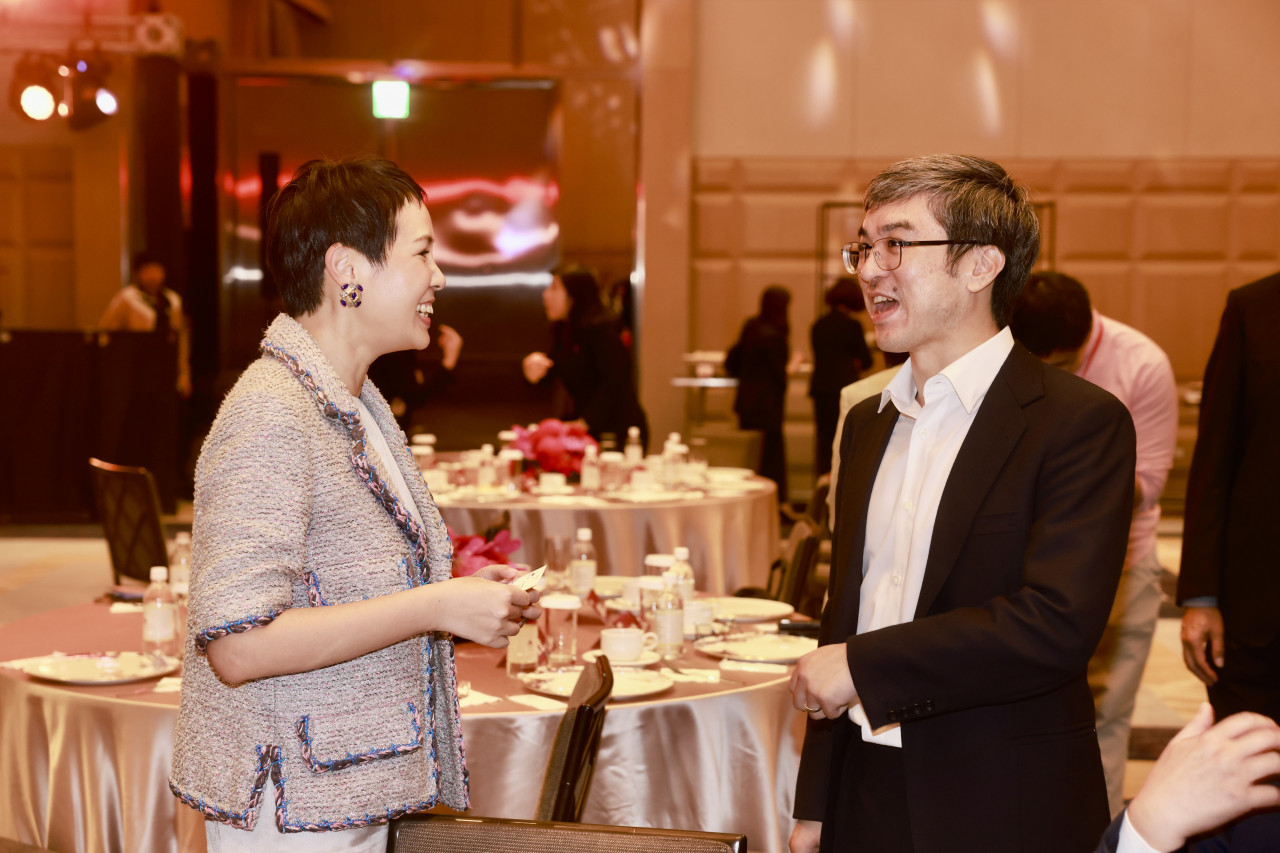 永豐銀董事何奕佳與潤泰集團出席代表尹崇堯相談甚歡。(攝影:吳東岳)