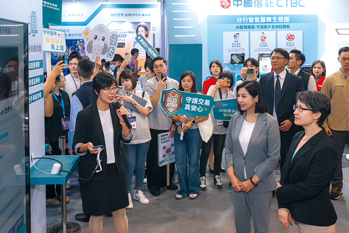 「金融防詐」是本屆博覽會三大主題之一,中國信託呼應這個號召,除了「AI信用卡秘書」,現場更展出全新升級的「AI智能防詐ATM」。這項創新服務結合AI影像分析與多重安全機制,即時偵測使用者是否以口罩、安全帽等物品遮掩臉部,並自動跳出警示頁面提醒移除遮蔽物。若鏡頭辨識到多張臉孔或可疑行為,系統將即時提醒,並提供「鎖定帳戶」、「調降限額」、「啟動警鈴」等安全選項,強化ATM的防護機制。中信銀行預計今年底前將陸續導入逾500台具備AI智能辨識技術的ATM,為客戶打造更安全的金融環境。