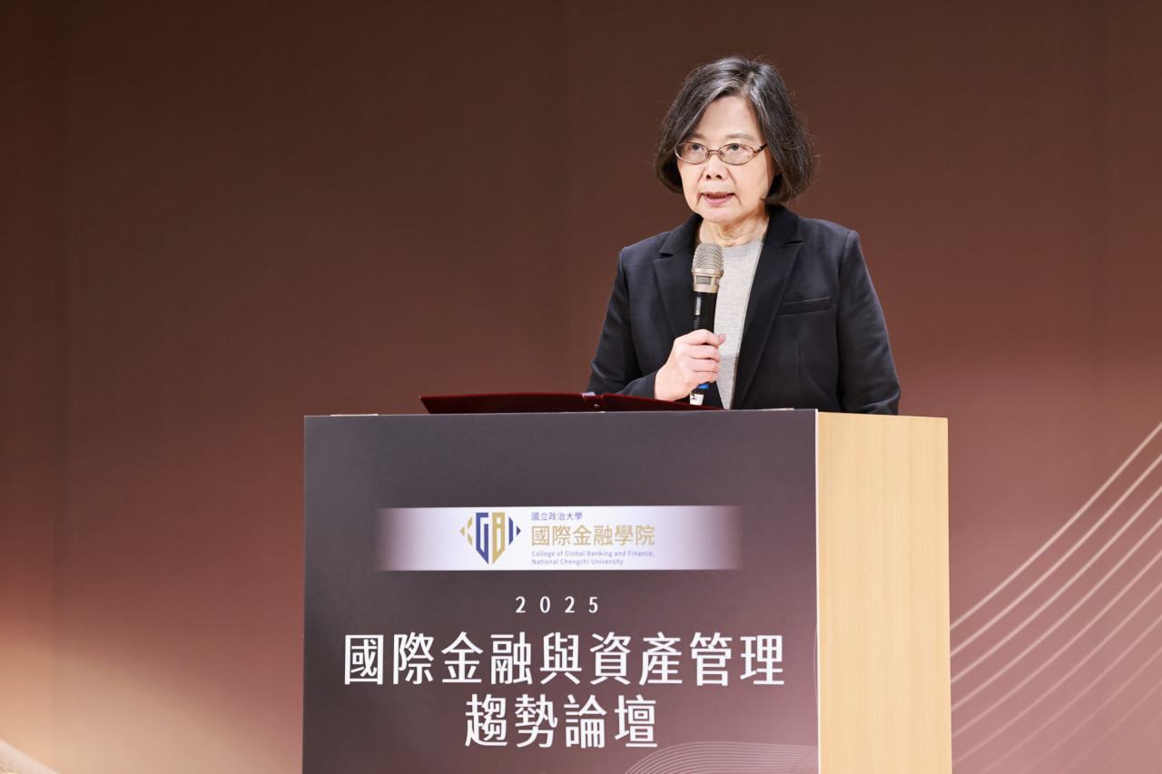 中華民國前總統蔡英文致詞時表示,金融業長期是支撐實體經濟的重要力量,但「根據金管會統計,目前金融業資產總值達一三三.五兆元,產值卻僅占GDP的六.五六%」,顯示金融產業「規模龐大卻附加價值不足」,仍有極大升級空間。她指出,如何將龐大資產轉化為創新能量、提升國家競爭力,是台灣未來的關鍵任務,並肯定政大國際金融學院在人才培育及國際鏈結上的努力,期許論壇成為產學交流的典範。