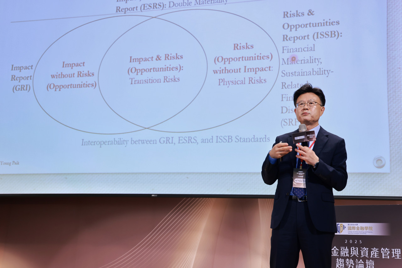 在「整合與解讀永續與財務報導」場次中,ISSB資深顧問Tae-Young Paik指出,隨著全球企業因應氣候變遷與永續發展壓力,各國紛紛強化揭露規範,台灣自明年起也將實施強制永續報告,成為亞洲領先國家。他說,ISSB S1、S2標準要求企業揭露財務與永續資訊,呈現氣候風險對收入、成本與資產的影響;「雙重重大性(double materiality)」成為新趨勢,兼顧企業對環境與社會的影響及投資人決策所需的財務透明度。
