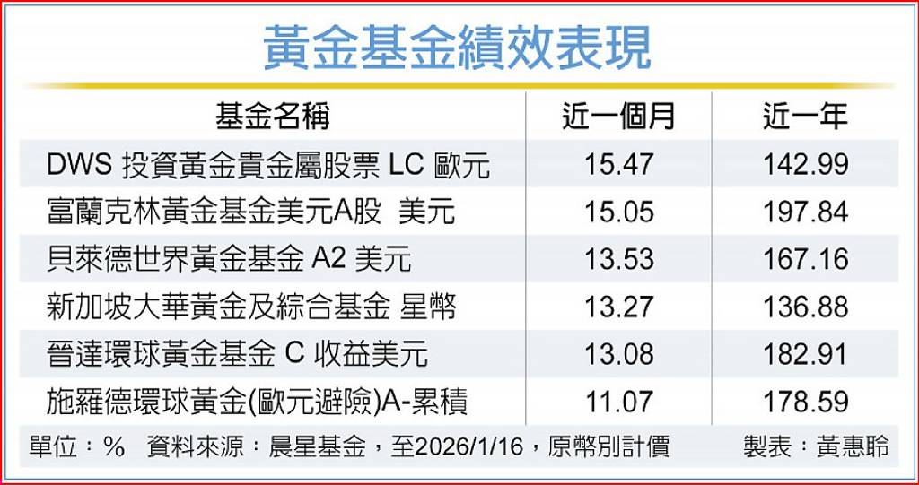 短期行情則由事件風險與政策不確定性推波助瀾。期元大S&P黃金(00635U)ETF研究團隊指出,截至元月15日為止,單周又上漲逾3.5%,黃金期貨2026年2月合約收在4,623.7美元。該研究團隊認為,美國司法部對鮑爾啟動刑事調查,使市場對聯準會獨立性擔憂再起,加上伊朗國內動盪、俄烏戰爭綿延、美國對委內瑞拉及格陵蘭的干預等地緣政治風險升高,帶動避險需求推升金價再創新高。