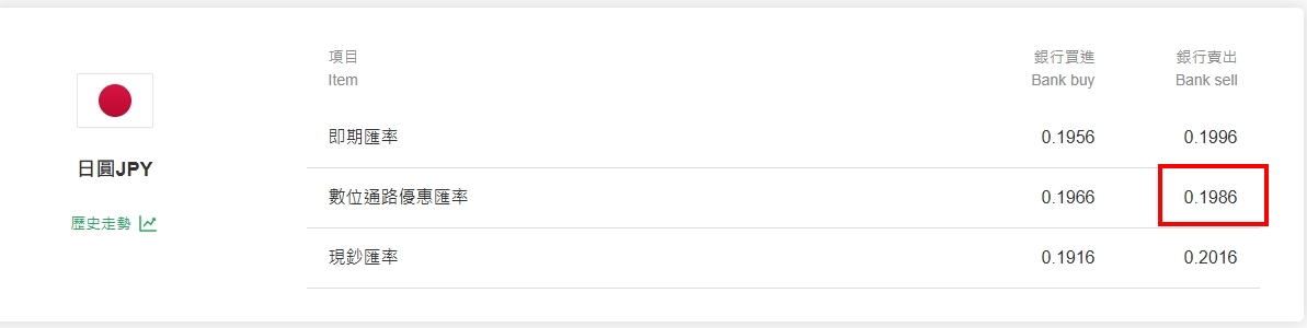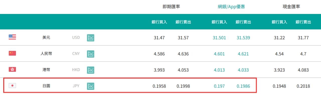 哪間銀行換匯最划算?玉山網銀APP、國泰網銀數位通路優惠價皆來到「0.1986」,都已經來到0.2以下,等於去日本購物「定價直接除以5」就是台幣價格。