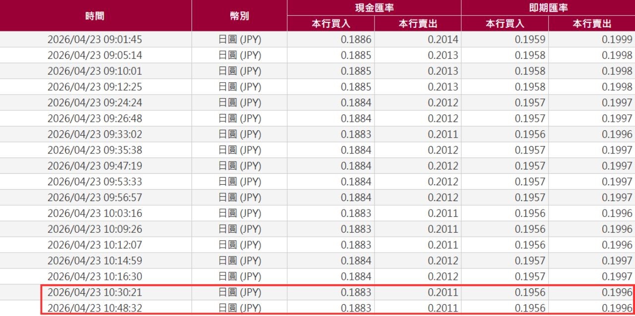 日幣甜甜價又來了!周四(4/23)台銀日圓現金牌告價出現「0.2011」,創下近9個月以來新低,讓不少民眾又直呼「趕快換錢」。