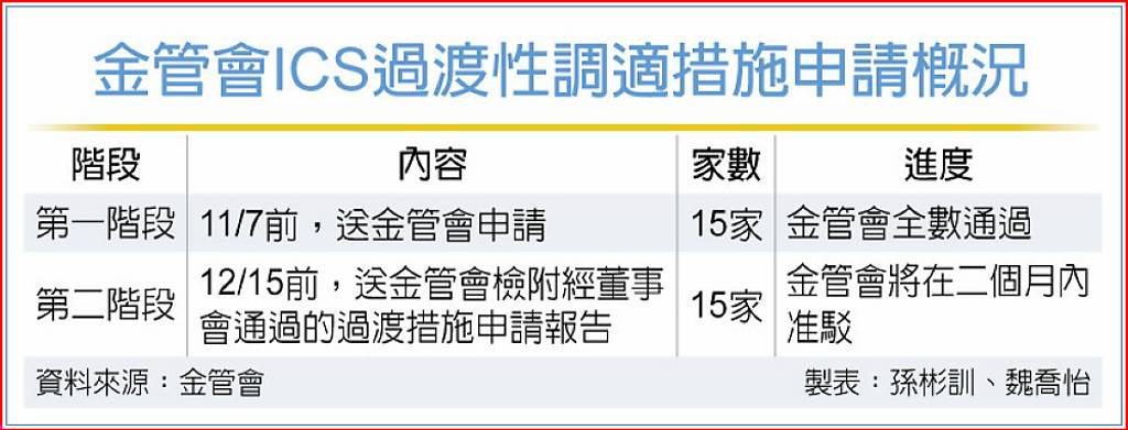 保險業明年將接軌新一代清償能力制度(TW-ICS),屆時保險資本標準(ICS)將取代現行保險資本適足率(RBC)制度,金管會已經於10月中旬公告ICS過渡性調適措施,其中,要申請過渡措施的壽險公司11月7日前要申請,金管會日前指出,共收到15家壽險公司送件申請過渡措施。金管會保險局主任秘書古坤榮16日指出,第一階段15家全數通過。