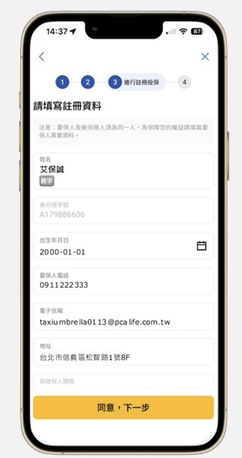 - 填寫基本投保資訊(例如姓名、身分證字號、出生年月日等)。