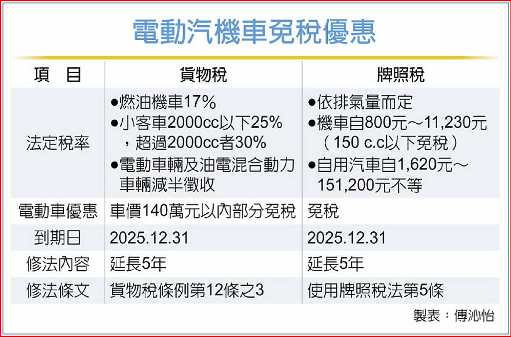 相關法案已報送行政院,原本經濟部爭取延長四年,但財政部考量整體政策方向是達到2030年淨零碳排目標,認為延長五年到2030年較妥適,評估包括牌照稅、貨物稅免徵,扣除可發揮的經濟效益後,每年稅損約96億元。
