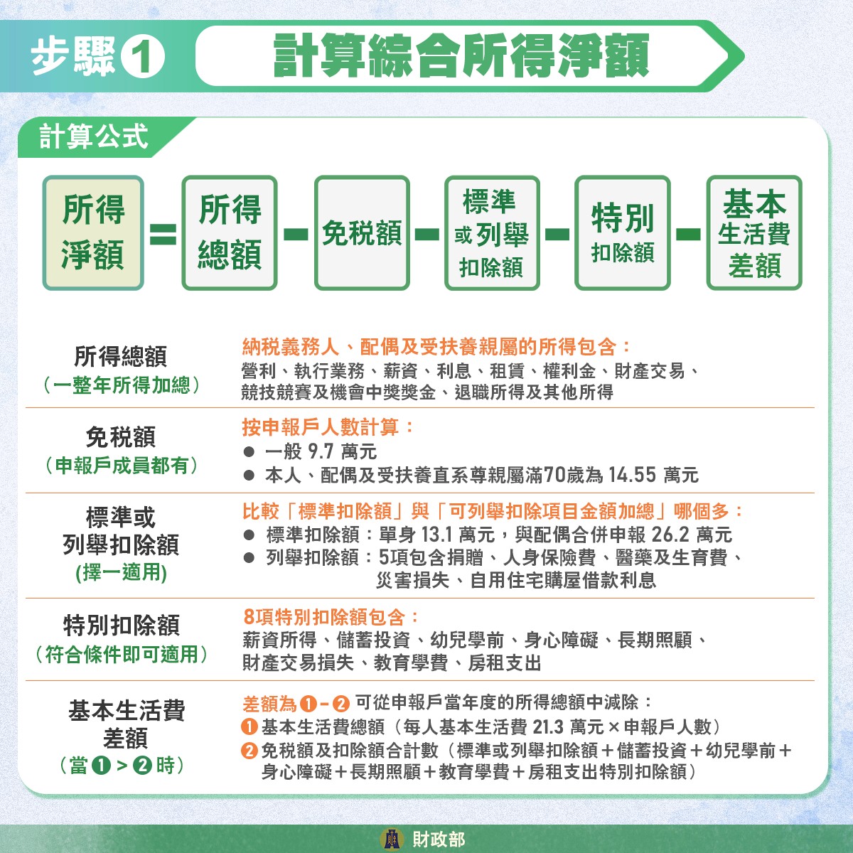 所得淨額=所得總額-免稅額-標準或列舉扣除額-特別扣除額-基本生活費差額