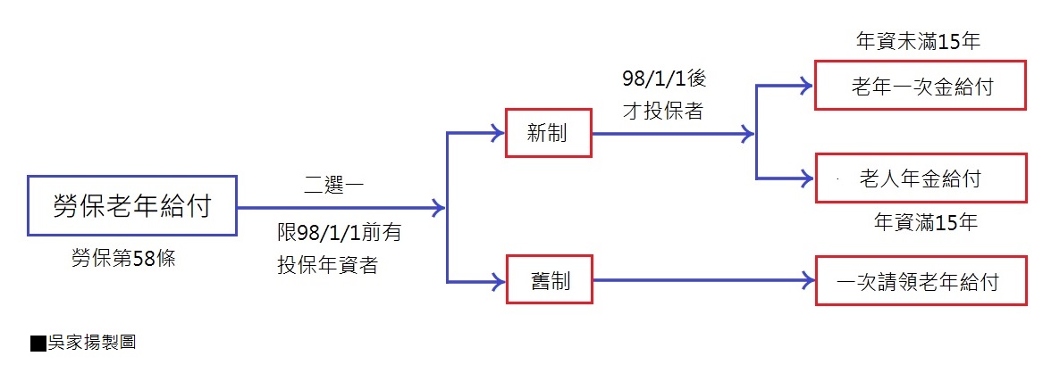 勞保老年給付因為政策的改變,區分為「新制」和「舊制」,依據條件而有3種不同的情境:老年一次金給付、老年年金給付和一次請領老年給付。
