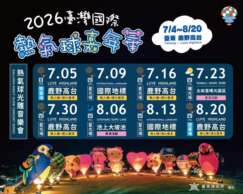 A:2026台東熱氣球嘉年華於7月4日至8月20日舉行。