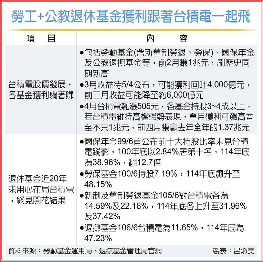 權王台積電向來是退休基金的最愛,各基金對台積電持股在32%~47%不等,近日「台積電條款」發威,推升4月來到27日止,台積電單月飆漲505元,形同政府操作的退休基金「躺著賺」,保守估計,4月單月可輕鬆獲利逾1兆元,很可能是去年一整年的獲利水準;而勞退基金分紅大發利市,估計超過6萬元,也將輾壓去年全年不到6萬元。