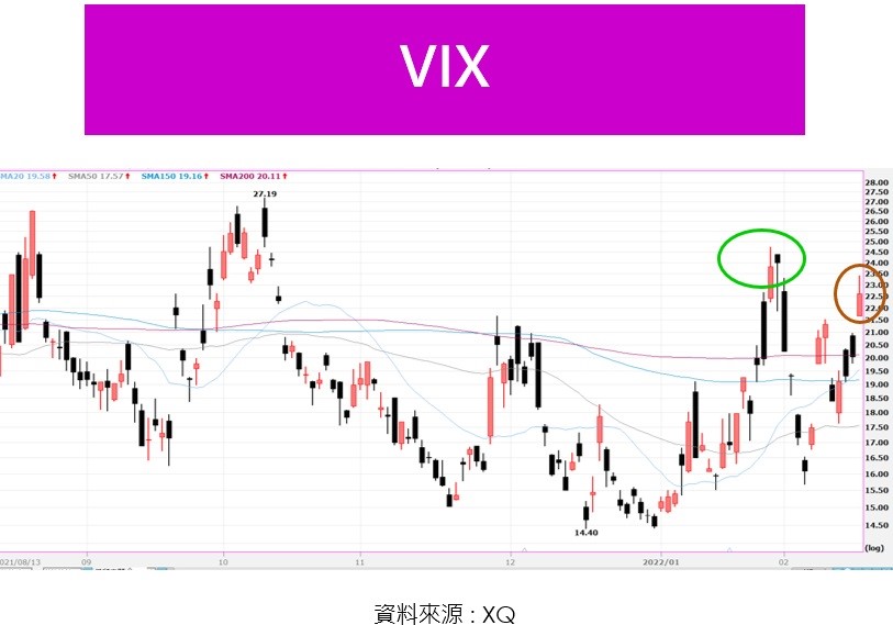 附圖五為黃金走勢圖,近半年震盪趨堅,主因除了戰爭可能性上揚外,抵抗通膨買盤也是原因之一;附圖六為VIX,代表芝加哥期權交易所市場波動率指數,常稱為「恐慌指數」,近期雖然逐步上升(如棕色圈圈),可是並未超過1月下旬的高點(如綠色圈圈),透露出投資者的情緒雖緊張,但仍未失控。