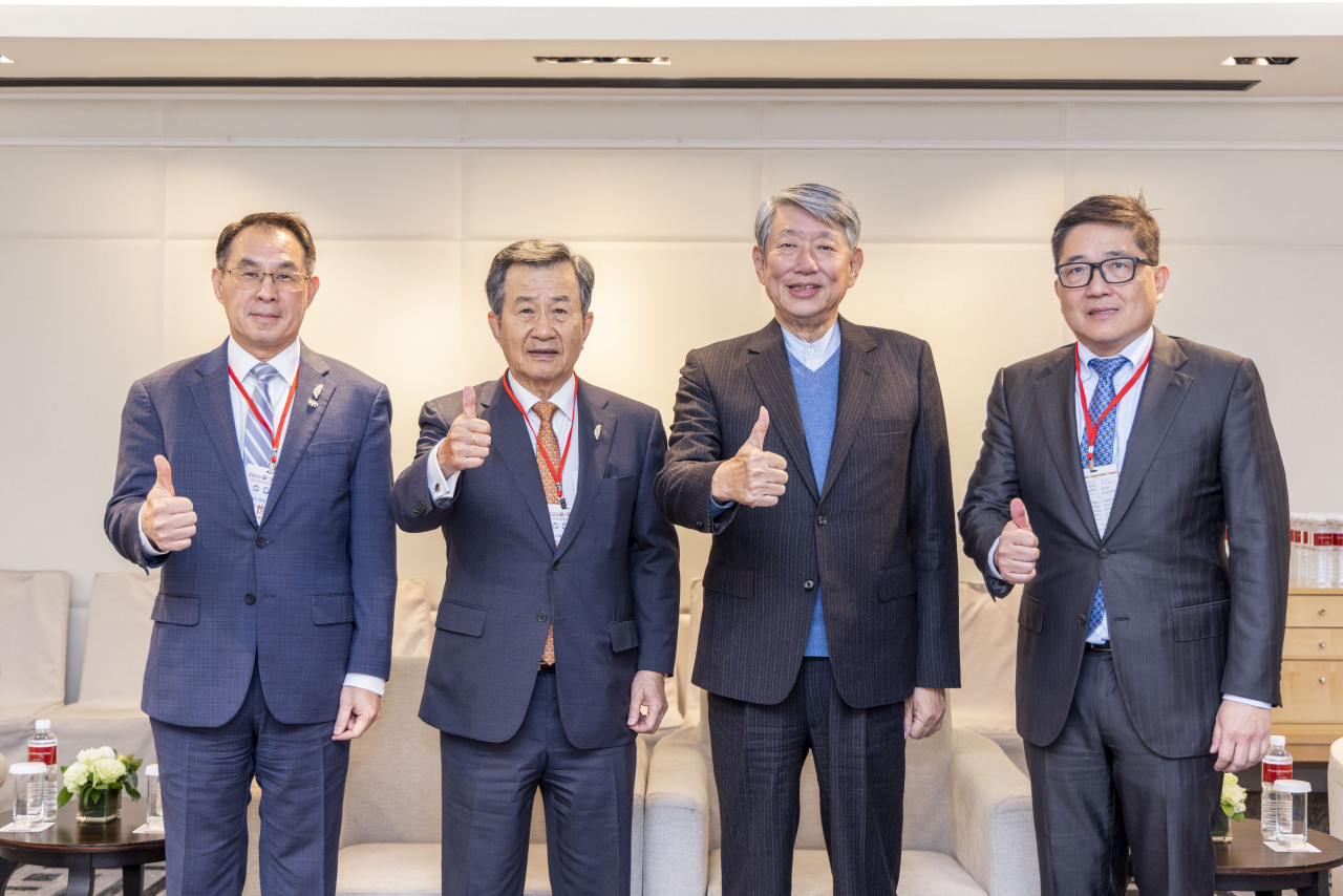 ▲(左起)北美洲台灣商會聯合總會總會長陳世修、世界台灣商會聯合總會總會長吳光宜、經濟部長郭智輝、亞洲台灣商會聯合總會總會長林凱民,於「2025臺.美.亞洲-新供應鏈商機交流論壇」開始前,針對全球供應鏈、美國最新關稅政策等議題進行會前晤談。