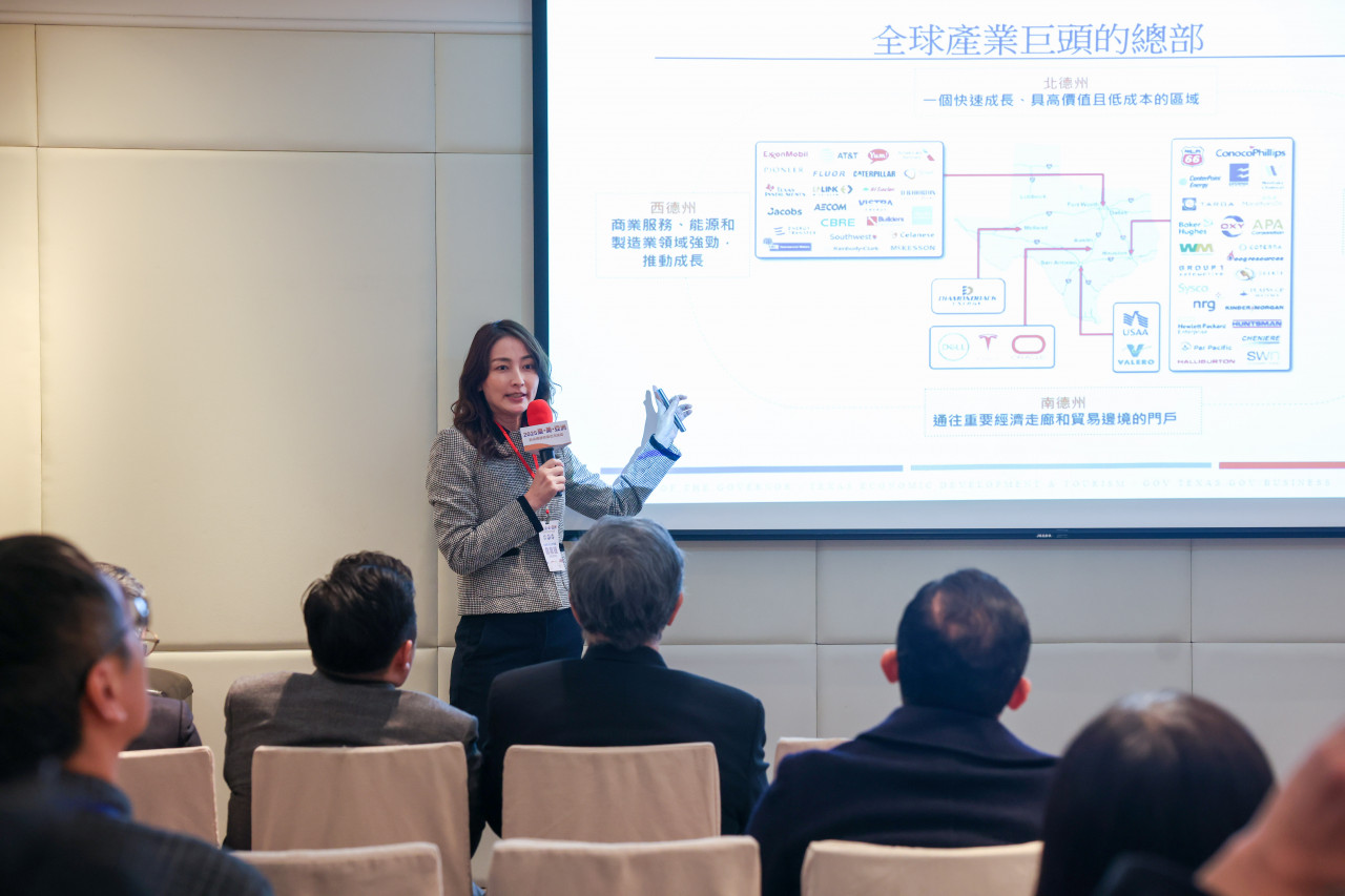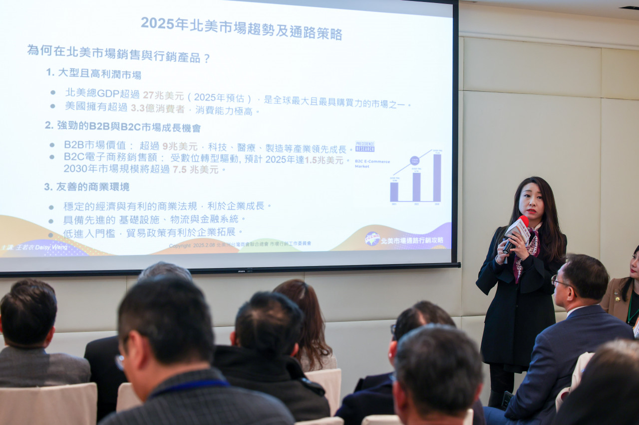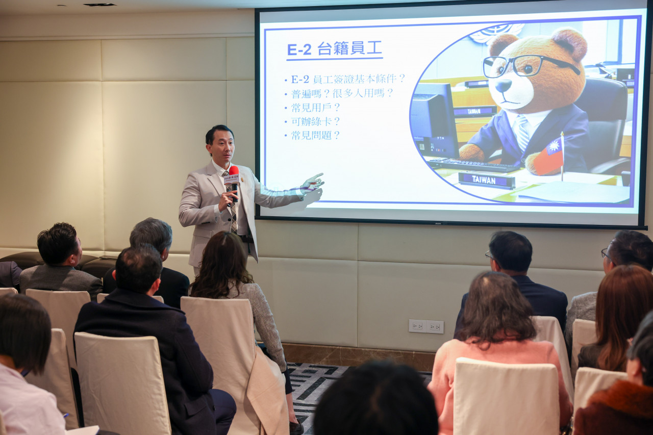 北美洲場由專攻市場行銷的北美洲台灣商會聯合總會市場行銷委員會王若衣主任委員打頭陣,分享2025年的北美市場趨勢及通路策略;緊接著由綠楓法律集團陳啟耕主持律師,詳細解說赴美之前應注意哪些移民與簽證相關問題;最後由美國德州駐台辦事處商業投資開發 詹惠捷,介紹了德州的投資環境與商機優勢。